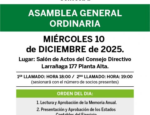 La Sociedad Médico Quirúrgica De Salto – IAMPP convoca a Asamblea General Ordinaria a realizarse el MIÉRCOLES 10 de DICIEMBRE de 2025. 1er. llamado: Hora 18:00 2do. llamado: Hora: 19:00 (sesionará con el número de socios presentes) Orden del día Lectura y Aprobación de la Memoria Anual.-Presentación y Aprobación de los Estados Contables del Ejercicio.-Informe…