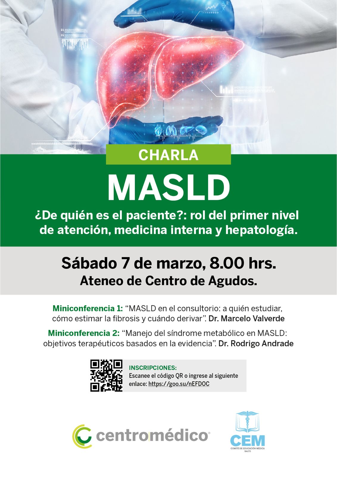 El sábado 7 de marzo, a las 8 hrs. en el Centro de Agudos, se llevará a cabo la Charla MASLD «¿De quién es el paciente?: rol del primer nivel de atención, medicina interna y hepatología.«.