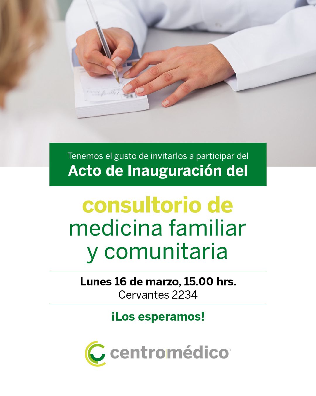 El lunes 16 de marzo, a las 15 horas estaremos inaugurando formalmente el nuevo Consultorio de Medicina Familiar y Comunitaria de nuestra institución. El mismo se encuentra ubicado en Cervantes 2234 (pasando Avda. J. De Viana) y tiene como área de influencia los barrios: Malvasio, Progreso, Mi Tío, Los Ingleses, Federico Moreira, Luján, Ceibal, Jardines, Umpierre, priorizando la atención de usuarios de nuestra institución que residan allí.