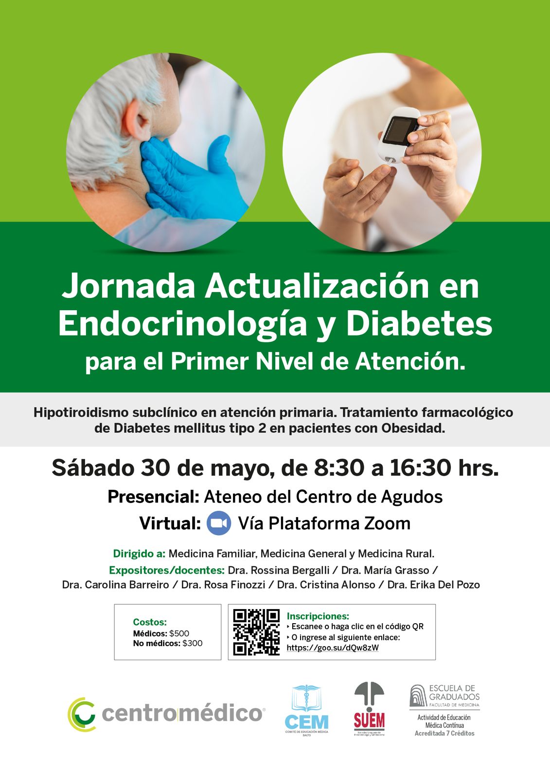 El sábado 30 de mayo, de 8:30 a 16:30 hrs. en el Ateneo del Centro de Agudos, se llevará a cabo la Jornada sobre Actualización en Endocrinología y Diabetes para el Primer Nivel de Atención y Tratamiento farmacológico de Diabetes mellitus tipo 2 en pacientes con Obesidad.