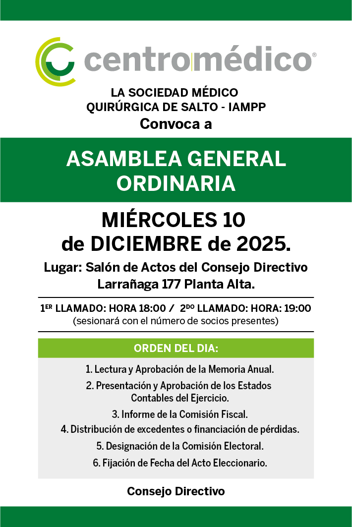 La Sociedad Médico Quirúrgica De Salto – IAMPP convoca a Asamblea General Ordinaria a realizarse el MIÉRCOLES 10 de DICIEMBRE de 2025.